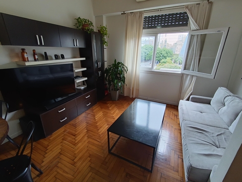 Departamento de 1 ambiente completamente reciclado en impecable estado. Instalaciones sanitarias, gas y electricidad a nuevo. Se encuentra en un piso 4&#176, con vista abierta sobre Av. 9 de Julio, mucha luz y sol. Excelente ubicacion, ideal para renta o para habitar. Incluye placard, modular y aire acondicionado Split. Se compone de un ambiente en L, cocina con conexion para lavarropas, baño con ducha y baulera en subsuelo. El edificio cuenta con encargado y terraza. Posee 32 m2.